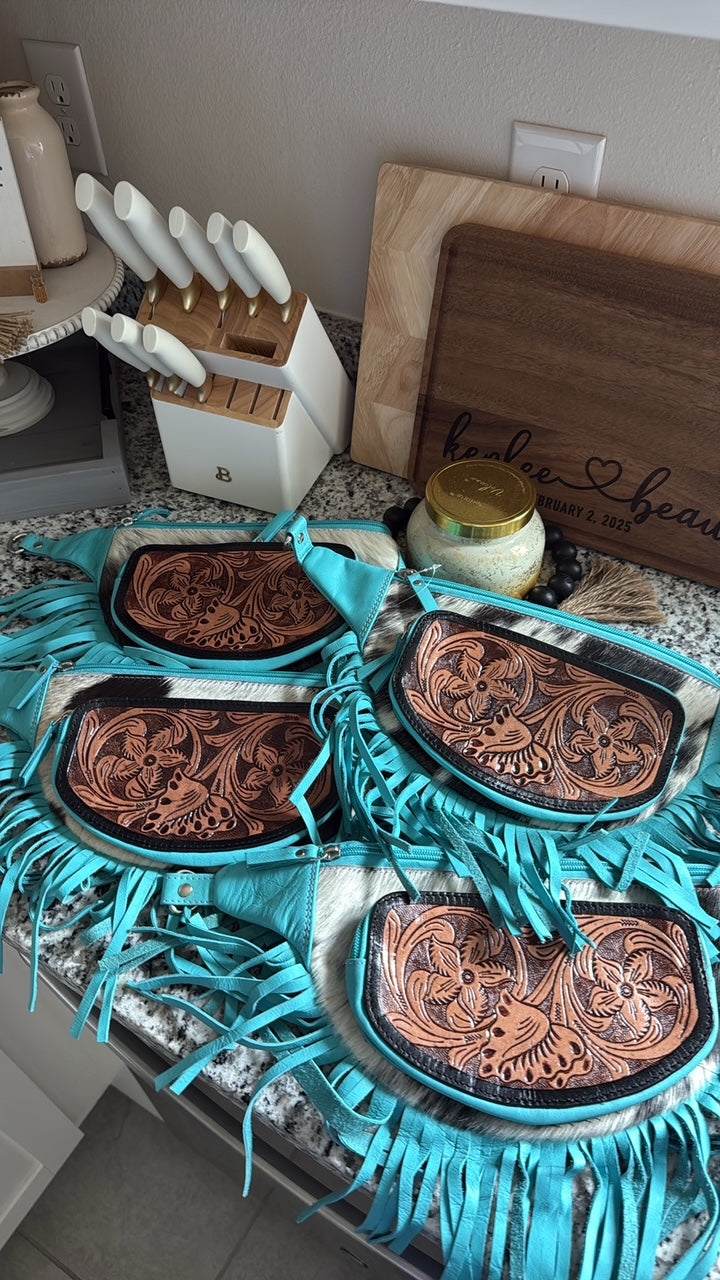 Blue Fringe, Tooled Leather & Cowhide Fanny Pack