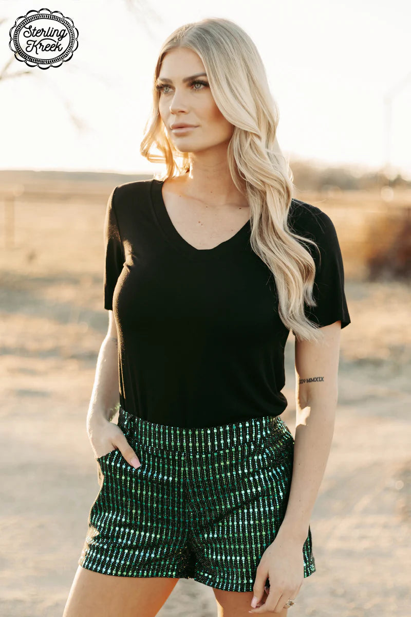 Add some flair to your wardrobe with our Shimmy Up Shorts in Turquoise! These black shorts are sure to turn heads with their sparkly turquoise sequins. Perfect for adding a pop of color to any outfit, they also feature two pockets and an elastic waistband for comfort. Go ahead, shimmy on up! These shorts are roomy, size down if in between sizes.